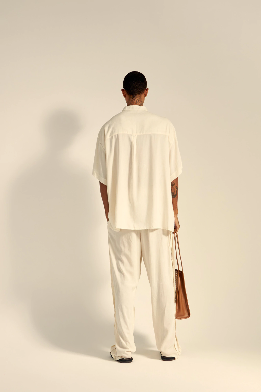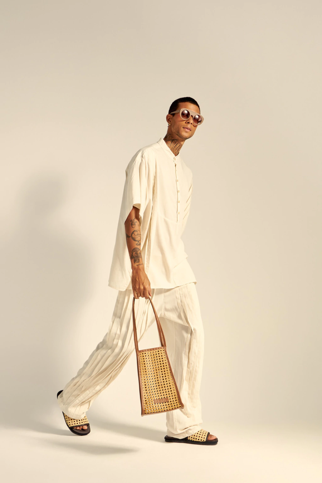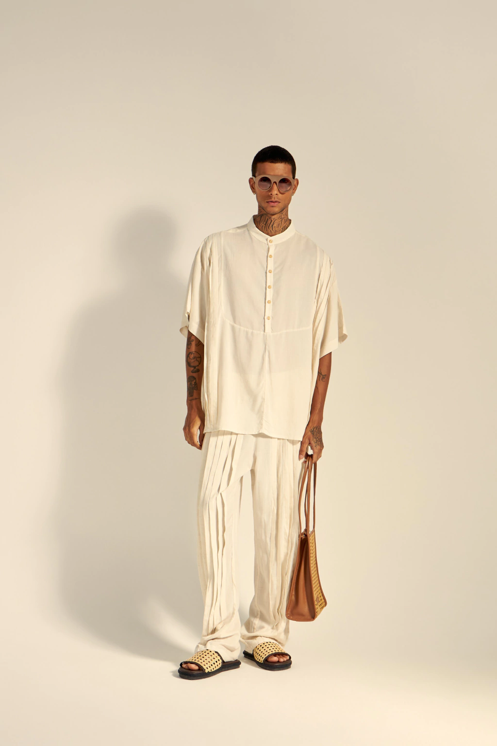 Design: Com modelagem ampla e fluida, a bata pregas possui gola padre e fechamento frontal por botões, criando uma linha visual limpa e elegante. As mangas curtas amplas proporcionam liberdade de movimento e um toque contemporâneo. O destaque fica por conta das delicadas pregas frontais, que acrescentam textura e sofisticação ao look.