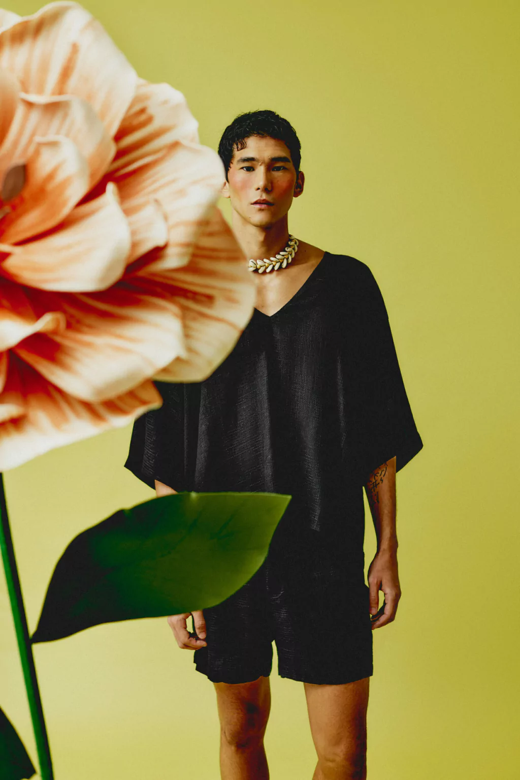 Design: Modelagem ampla e assimétrica, com mangas largas e decote em V que valoriza a linha do colo. A silhueta solta proporciona movimento e conforto, enquanto o design minimalista traz elegância e modernidade em cada detalhe.