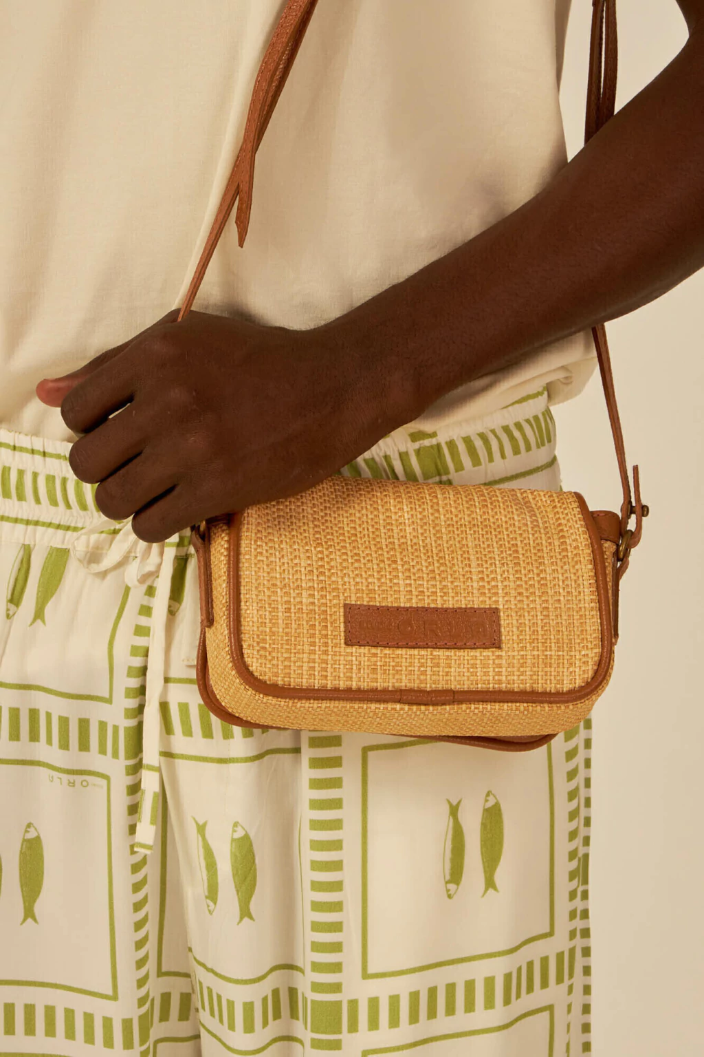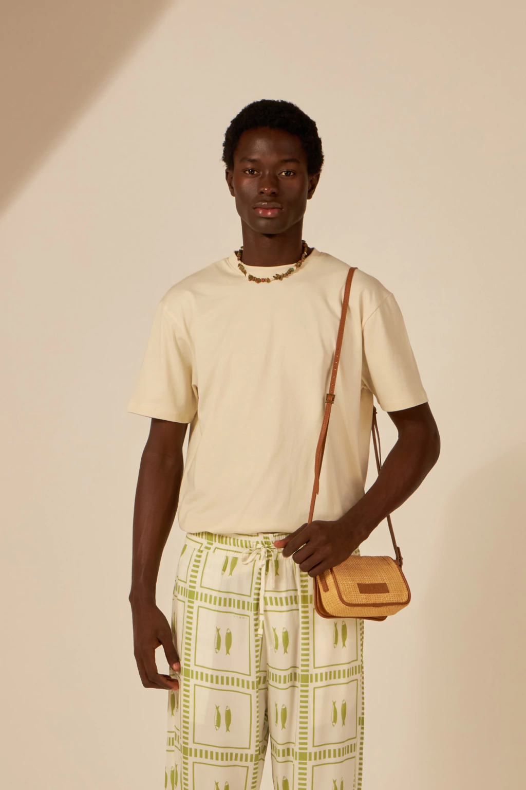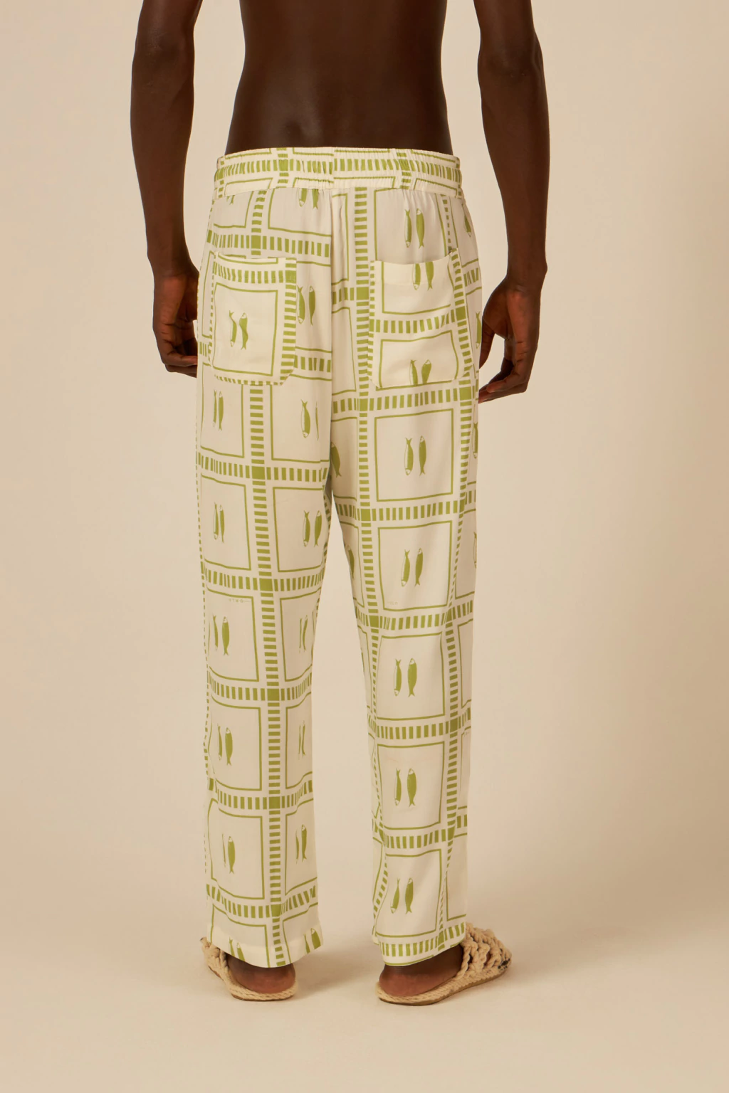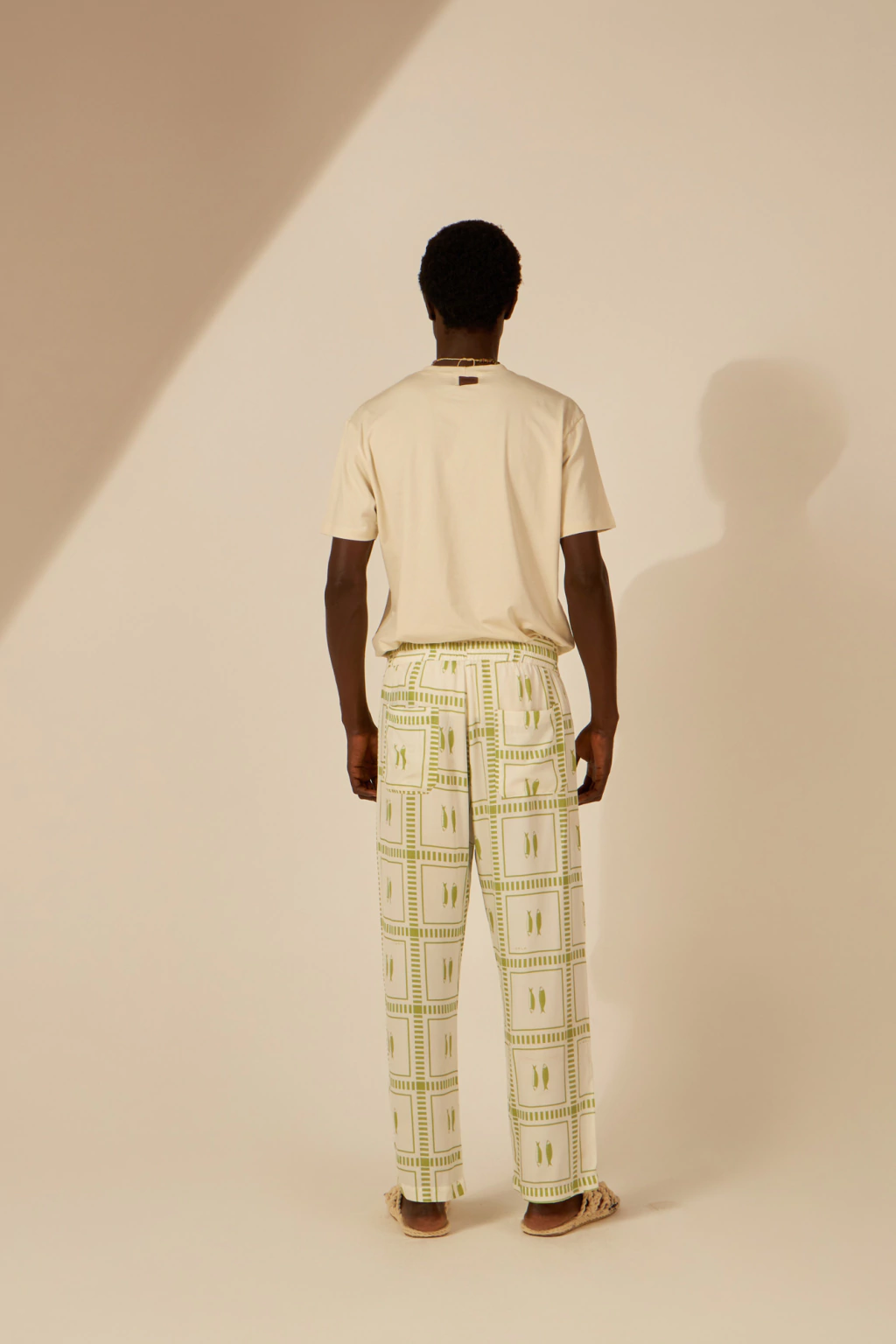 Design: Com modelagem reta com caimento leve, cintura média com elástico e ajuste por cordão embutido, garantindo praticidade e conforto. A estampa geométrica exclusiva em tons de verde sobre fundo off-white remete a elementos naturais de forma contemporânea, adicionando um toque artístico e autêntico à peça.