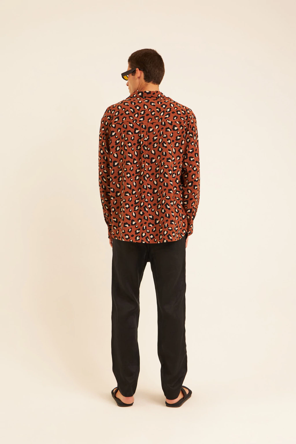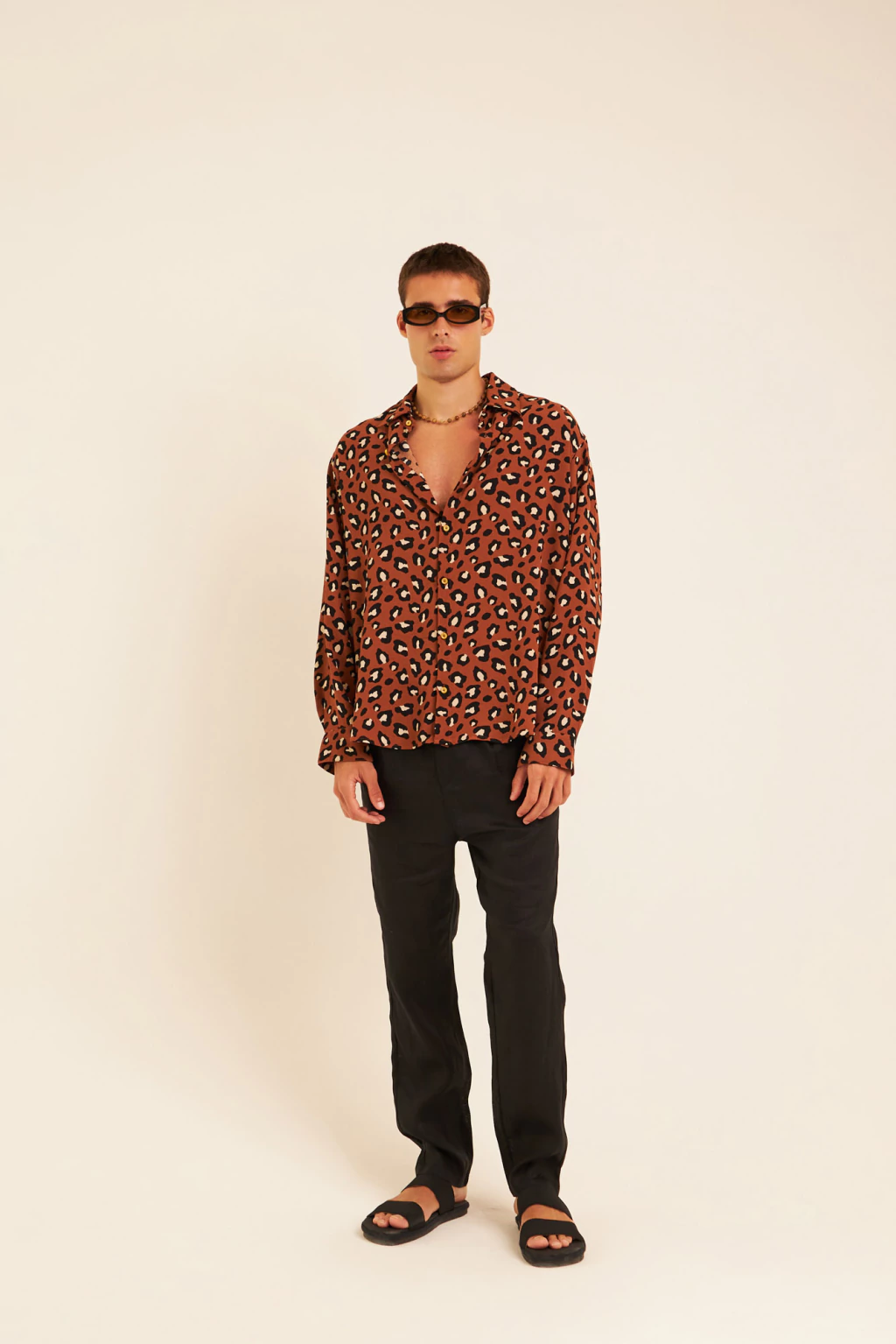 Design: Camisa de mangas longas com corte reto e caimento solto. A estampa de onça em tons terrosos é o destaque absoluto, trazendo uma vibe selvagem contemporânea. Possui colarinho estruturado, botões frontais e comprimento levemente alongado.