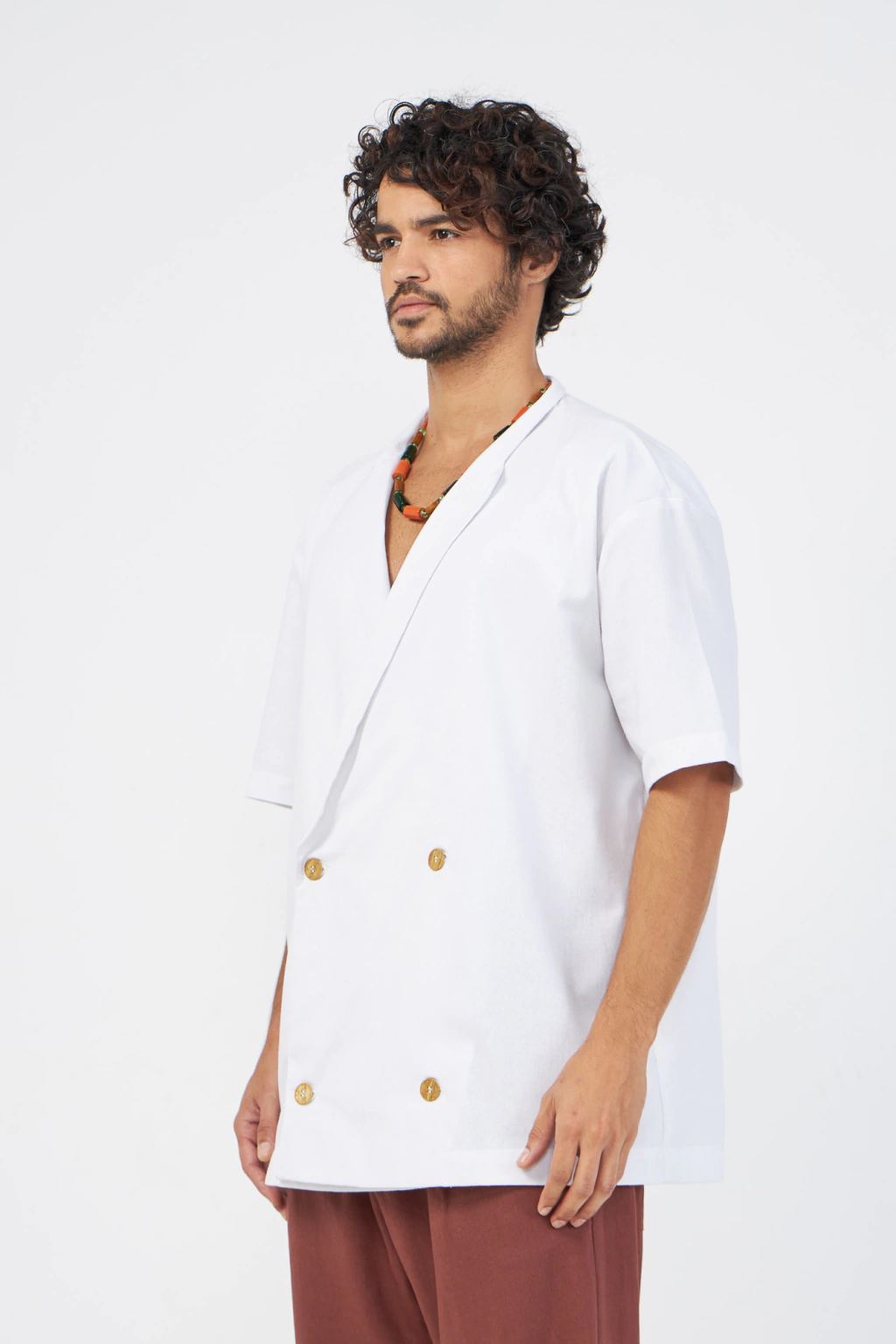 • Design: Modelagem ampla com inspiração no blazer, a peça traz gola ampla com transpasse frontal e fechamento por botões aparentes em tom amadeirado. As mangas curtas e o corte reto adicionam um ar contemporâneo e despojado, ideal para compor looks urbanos ou sofisticados com um toque criativo.