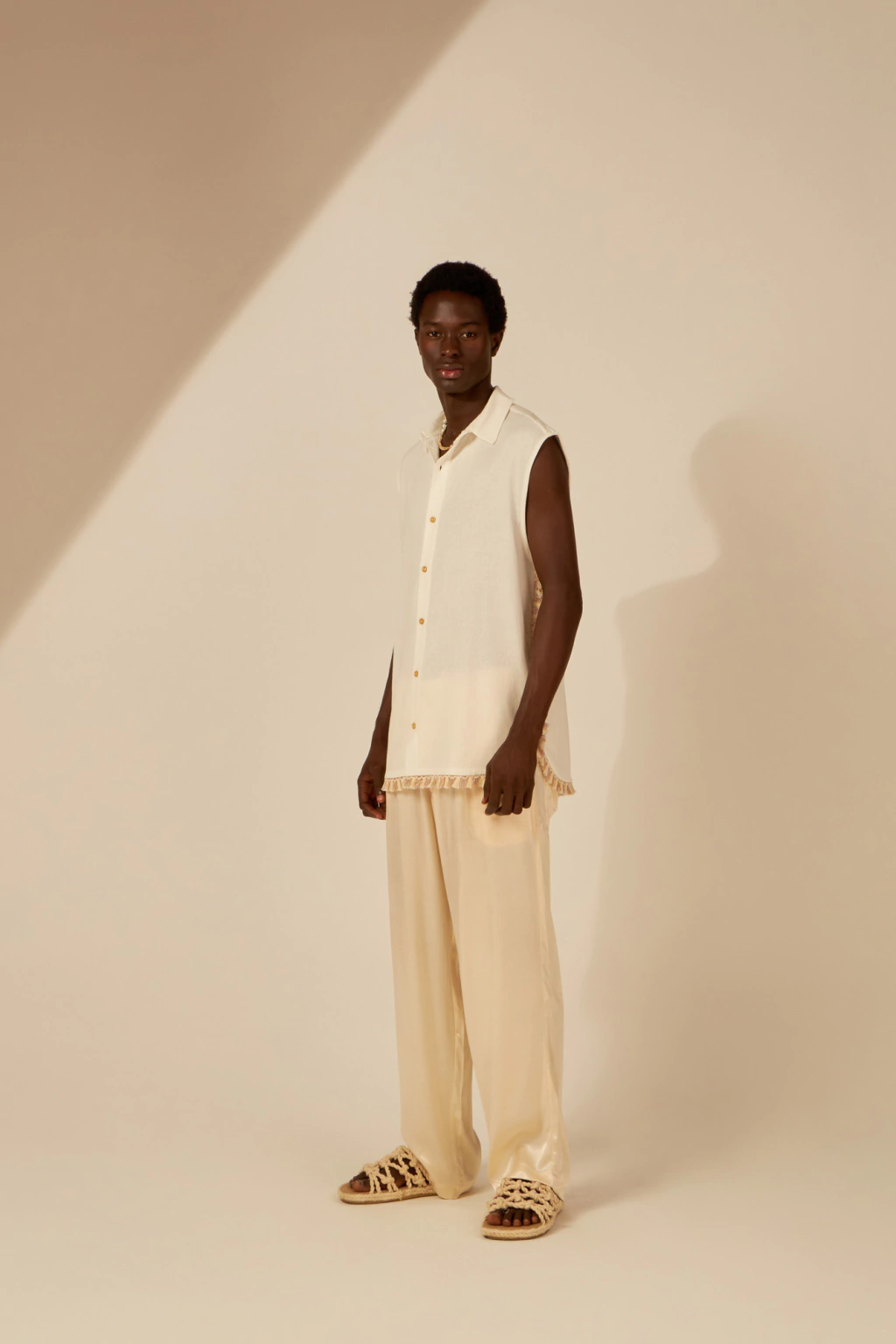 Acabamento: Os botões frontais delicadamente costurados garantem praticidade e elegância. As franjas artesanais são o grande destaque do acabamento, aplicadas com cuidado para valorizar ainda mais o design da peça. A costura é limpa e reforçada, mantendo a estrutura leve com um visual refinado.