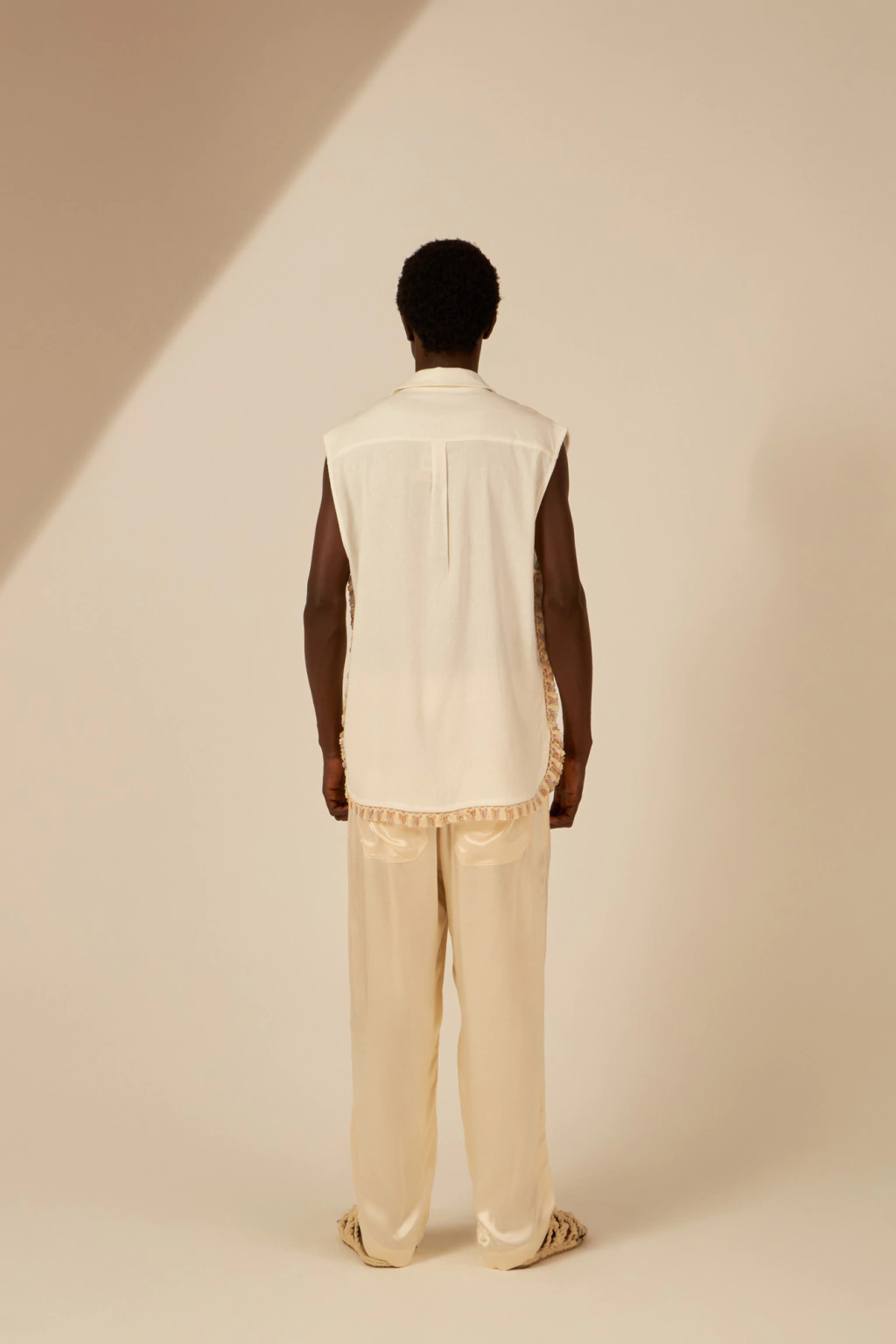 Design: Modelagem reta e alongada com cava ampla, a peça traz um visual descontraído, moderno e elegante. Possui gola tradicional, fechamento frontal por botões e um charmoso acabamento em franjas multicoloridas aplicadas nas laterais e na barra arredondada, conferindo movimento e originalidade ao visual.