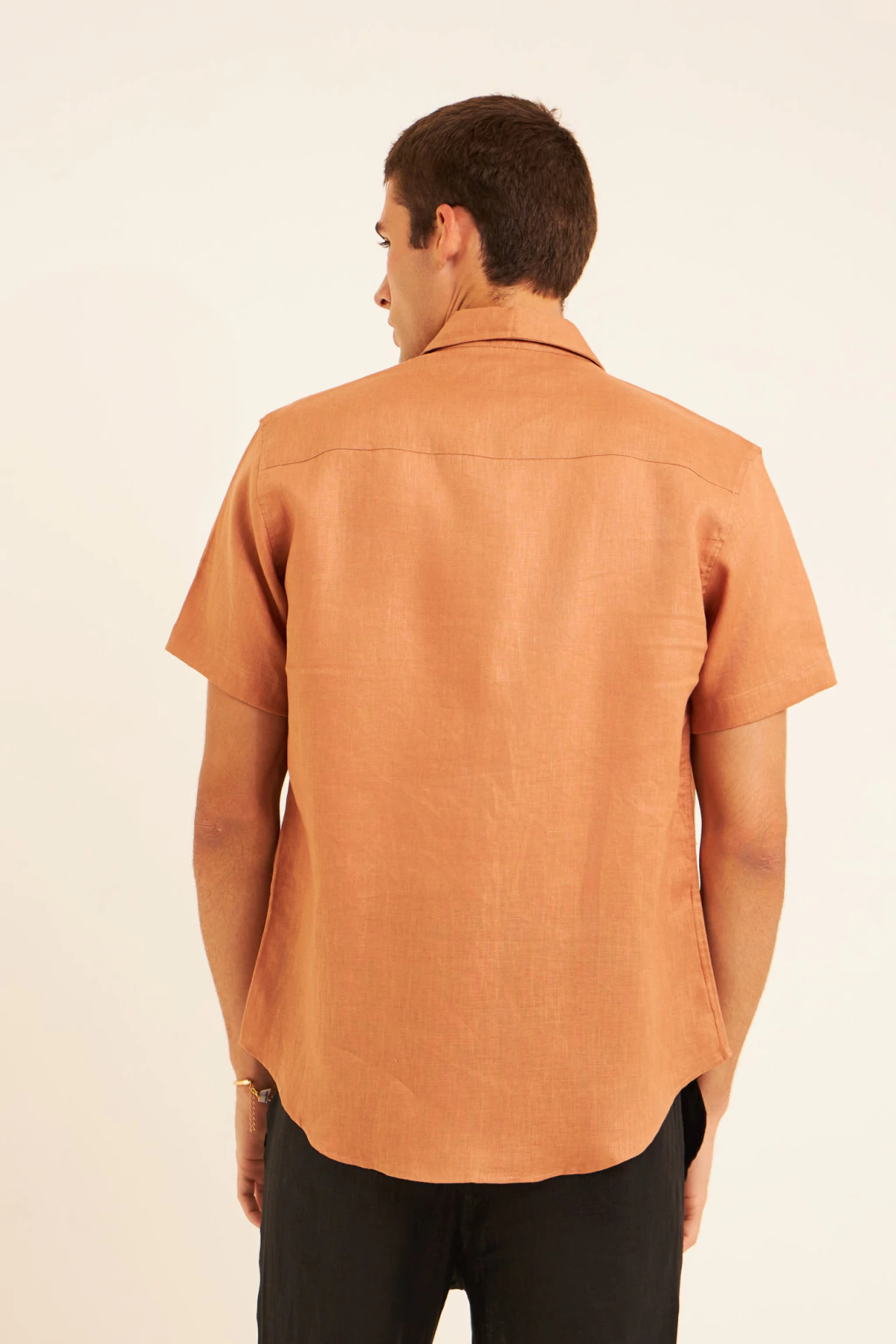 Acabamento: Botões discretos e alinhados ao tom da peça, costuras internas bem acabadas e reforçadas para maior durabilidade. O tecido mantém sua textura natural com leve aspecto rústico, característico do linho de qualidade.