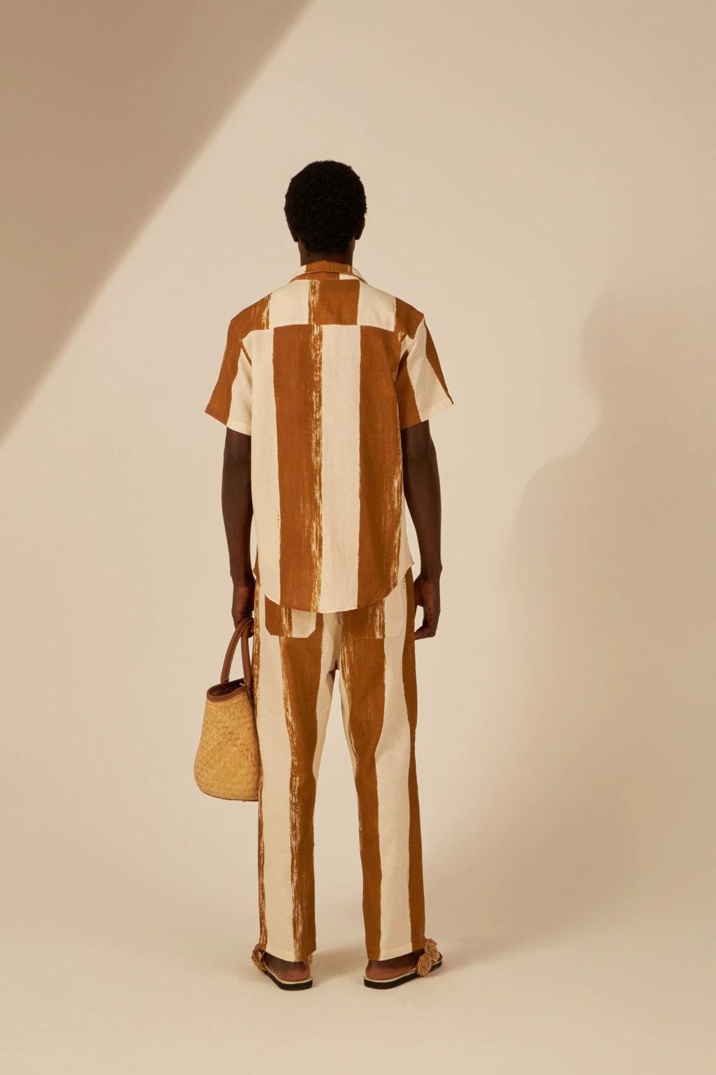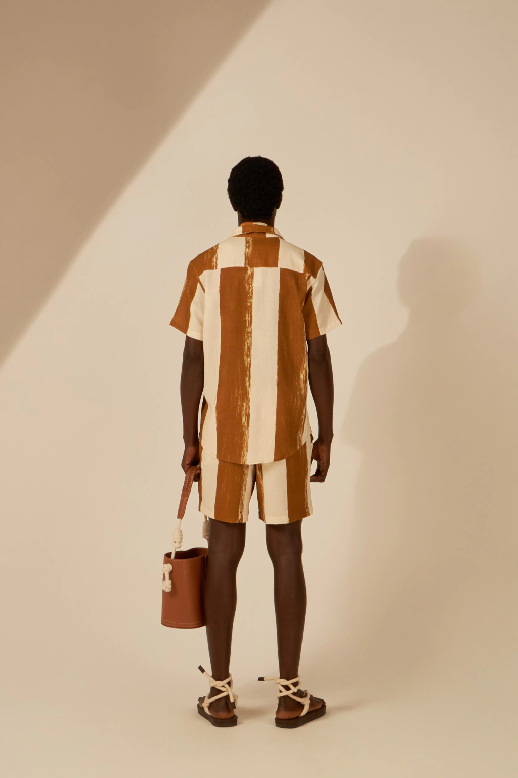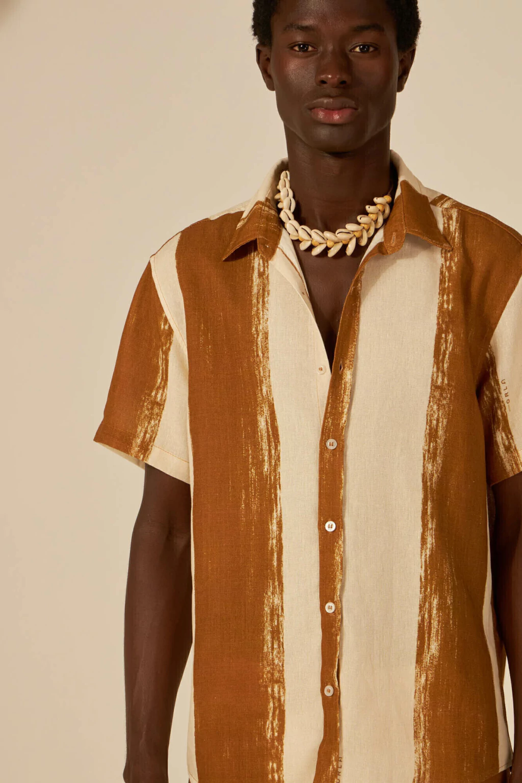 Design: Com modelagem reta e mangas curtas, a camisa traz uma proposta descontraída e contemporânea. Seu destaque fica por conta das listras largas em tons terrosos, aplicadas de forma artesanal, criando um visual artístico e exclusivo. A gola clássica e o abotoamento frontal complementam o design atemporal.