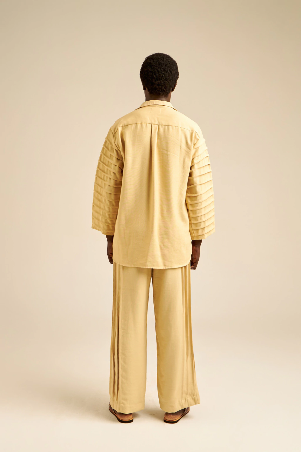 A camisa apresenta modelagem reta e solta, com nervuras verticais marcadas na parte frontal e nas mangas, criando uma estética única de movimento e profundidade. Possui gola clássica, fechamento frontal com botões e mangas longas com volume sutil, resultando em uma peça de aparência moderna, fluida e cheia de personalidade.