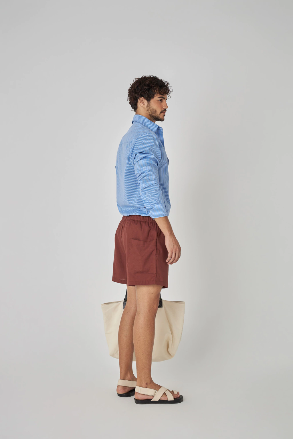 Acabamento: Com costuras discretas e reforçadas, bolso frontal funcional e botões delicadamente aplicados, que harmonizam com o visual leve da peça. A barra levemente arredondada permite o uso tanto por dentro quanto por fora da calça ou bermuda.