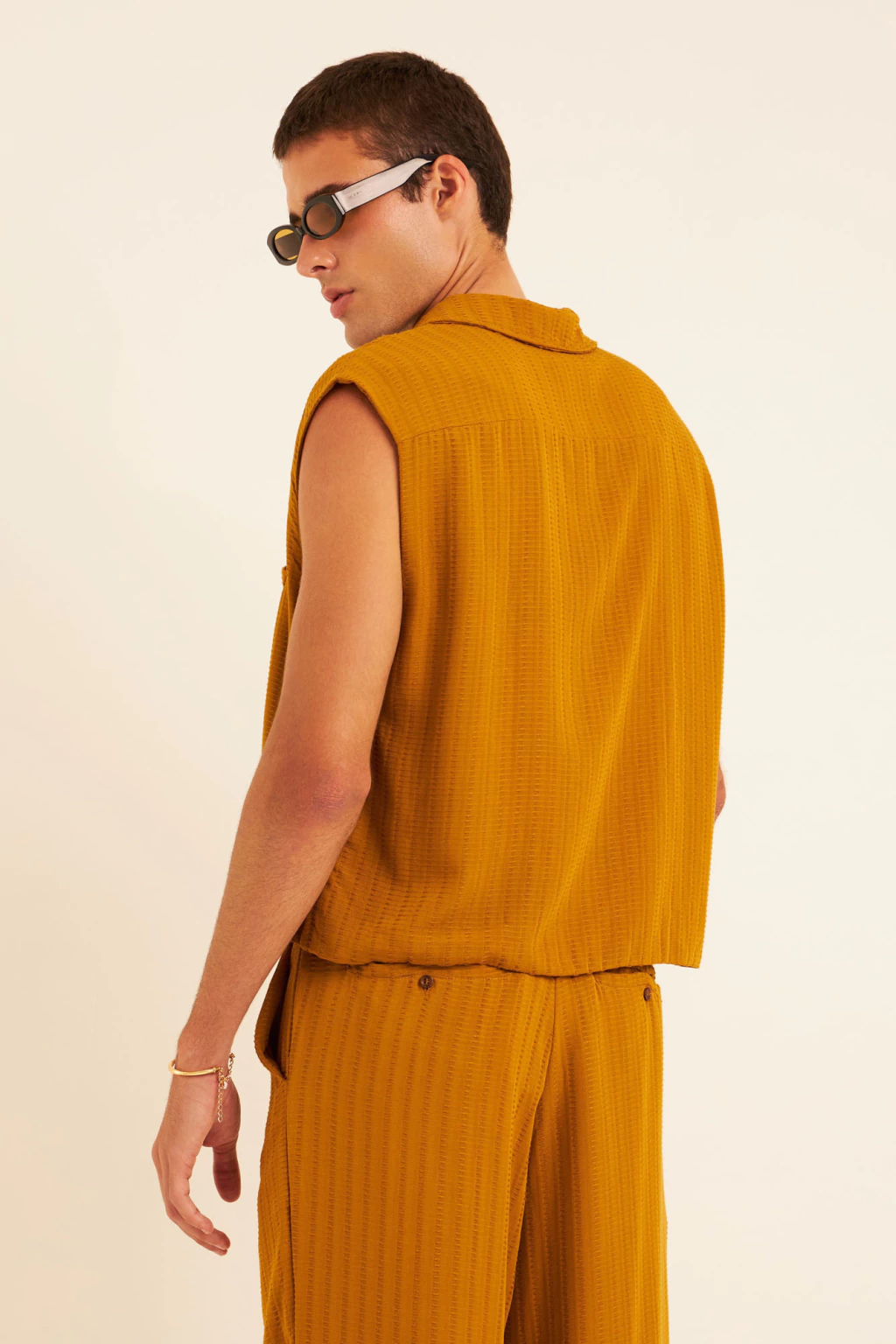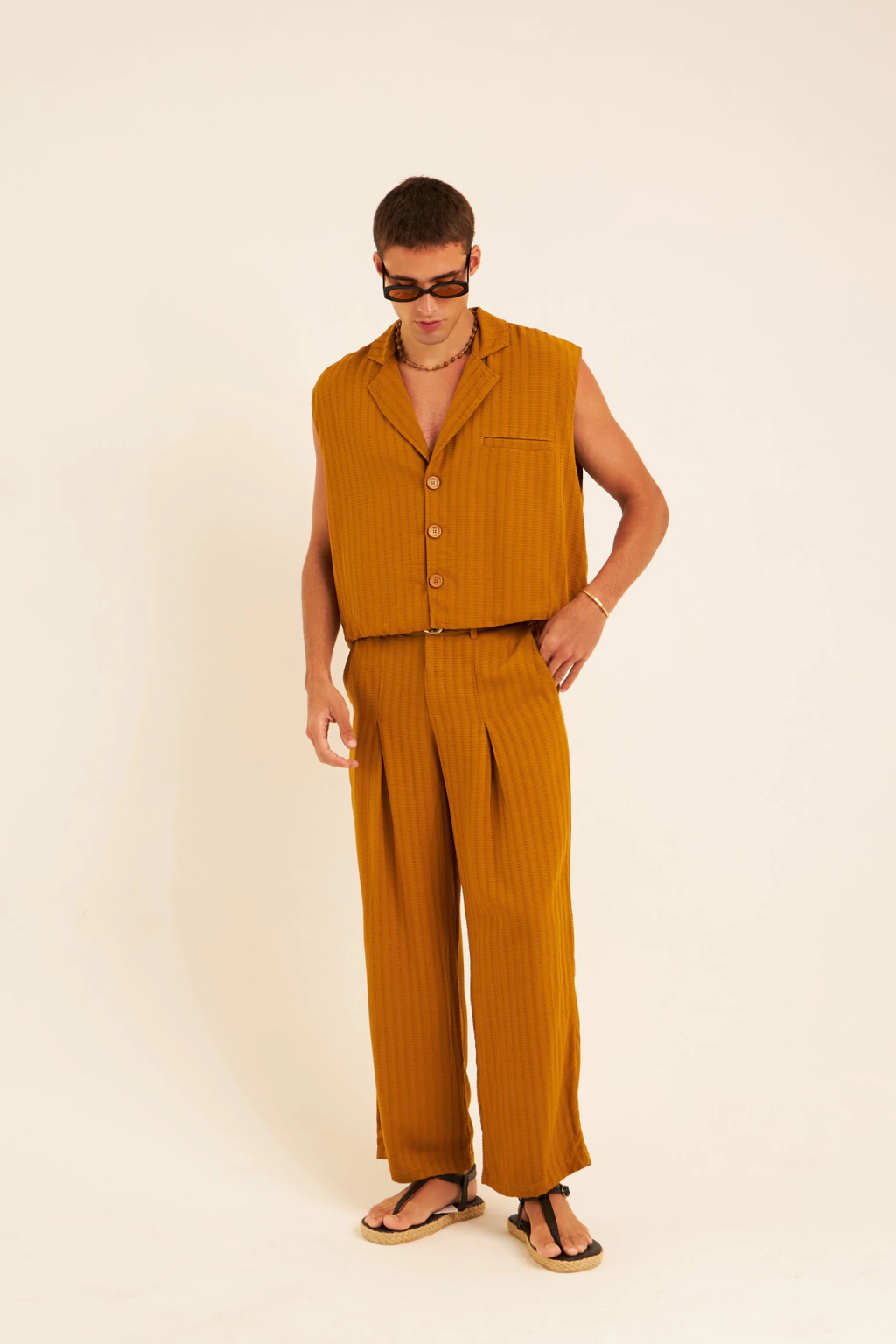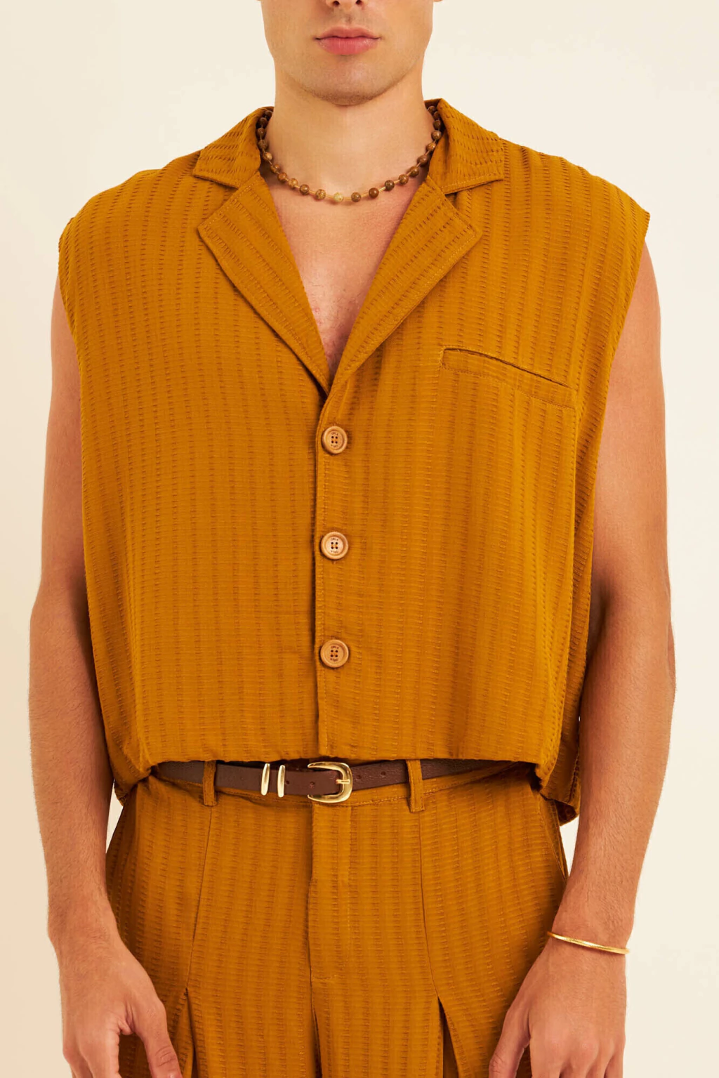 Design: O colete possui modelagem ampla e estrutura reta, com gola lapela e fechamento frontal por botões, conferindo um ar moderno e atemporal. Sem mangas, ele valoriza os ombros e oferece liberdade de movimento, sendo ideal para composições leves e ousadas. A pala nas costas e o bolso embutido falso no peito reforçam o acabamento de alfaiataria.